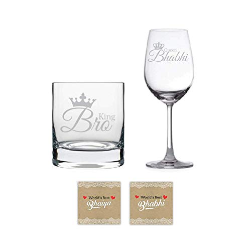 Gift Set Contents: 1 Wine Glass for Bhabhi, 1 Whiskey Glass for Brother, 2 Table Coasters