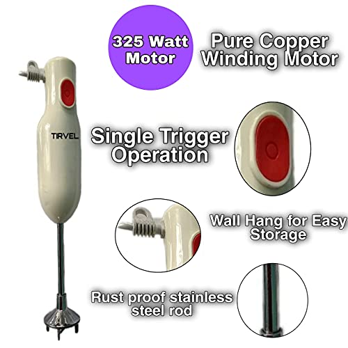 TIRVEL Electric Hand Blender Machine comes with the rust proof stainless steel metal for longer life durability. The electric Hand Blender Machine for kitchen comes with powerful 325 watt motor with pure copper winding. The Blender is designed for the easy grip while working with it, with the help of single trigger operation button. Note: the electric hand blender comes with powerful motor and can support blending of ingredients up to 20 minutes, do not use it for more than 60 sec in one go, if it is used for more than 60 sec and motor becomes hot , then let it cool for 2nd use. The electric hand blender features additional wall bracket for easy storage.