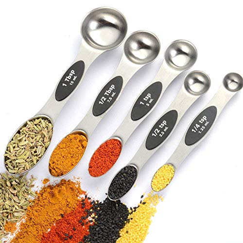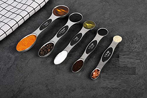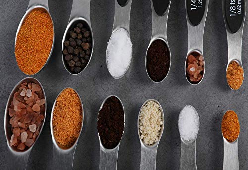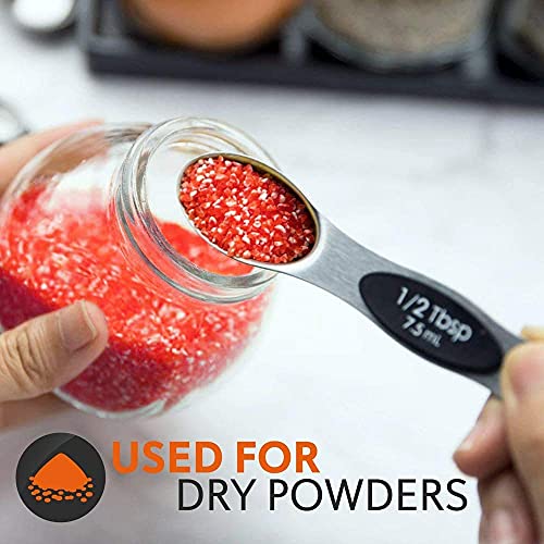CONVENIENT DOUBLE-SIDED USE Each measuring spoon is dual-sided. Slim end fits narrow spice jars while rounded design is perfect for scooping and measuring liquid ingredients. Steady, ergonomic handle allows spoons to lay flat on counter tops without spilling their content.