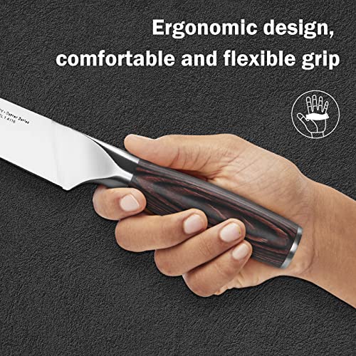 👍🏼【Perfect Design】The handle is Full-Tang inside and made of pakkawood outside. It is not only beautiful in appearance but also durable. Each of our kitchen knives has an ergonomic handle, which provide a comfortable and flexible grip.