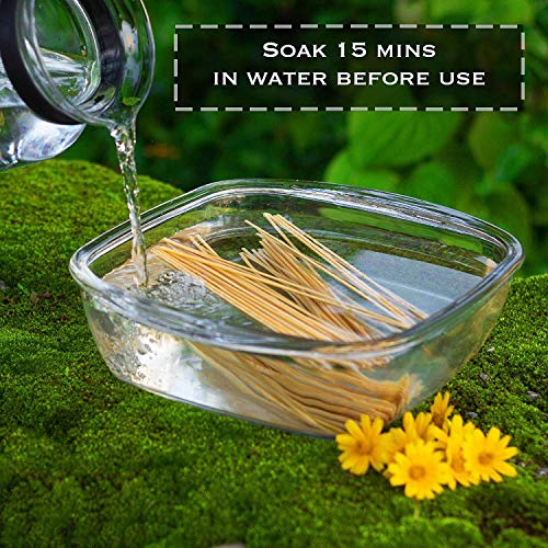 Fill a pan with water and place the bamboo skewers in the water. Make sure the skewers are fully submerged Allow the skewers to soak for a minimum of 20 minutes, and up to 3-4 hours to prevent from burning while cooking/ grilling For a gourmet presentation and an added depth of flavor to your grilled meals, experiment with soaking skewers in wine or juice. Dispose of any unused skewers Did you know that the Bamboo plant is one of the fastest growing plant on earth !!