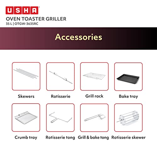 Includes Oven toaster grill, Skewers , Rotisserie, Baking Tray, Wire Rack, Crumb Tray, Rotisserie Tongs, Grill & Bake Tray Tong