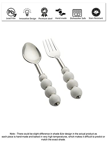 Silverware can enhance the look and feel of a meal, be it casual or formal. Flatware gives a table a unique form of elegance that is difficult to replicate. Give a spectacular touch to your home with VarEesha’s Regal Silverware. These exquisitely designed hand crafted cutlery sets are one of a kind, that would suit even a royal table. Made of premium quality stainless steel, this designer cutlery has beaded handles that give a magnificent look to this series. It has a variety of serving spoons, cake server and flatware that form a complete selection for your dining needs. An excellent option for gifting, this would be loved by all. Regal White Beads Stainless Steel Silverware Set has six pieces each of spoons and forks, that are convenient to handle and appealing to look at. They can be washed by hand and are dishwasher safe. Please note that the shade & size may vary slightly and imperfections may occur as each piece is hand crafted.