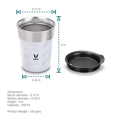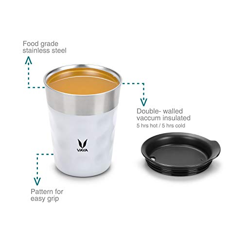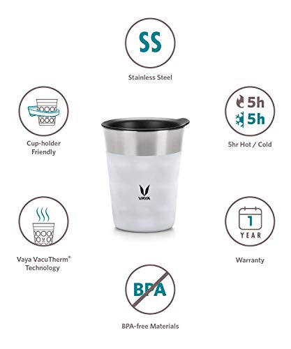 Keeps Your Beverages Hot or Cold with Advanced Technology:- Vaya Popcup is a double-walled and vacuum insulated, stainless steel cup with a lid. Vayaâ€s VacuTherm Technology keeps the beverage of your choice 5 Hours Hot or 5 Hours Cold. Your tea or coffee in Popcup will remain hot until the last sip, so you can enjoy the beverage while you leisurely finish your snack or reading your news paper. The sleek design is comfortable and easy to hold plus it fits in most cup holders.