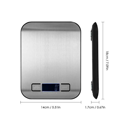 Specifications: Capacity: 5kg/1g, 10kg/1g (Optional). * Material: ABS and stainless steel. * Power Supply: 2 * AAA battery (Not included). * Units: g, lb, oz, ml, milk-ml, kg. * LCD Screen Size: Approx. 4 * 1.7cm / 1.57 * 0.67in. * Item Size: Approx. 18 * 14 * 1.7cm / 7.09 * 5.51 * 0.67in. * Item Weight: 222g / 7.83oz. * Package List: 1 * Kitchen Scale.