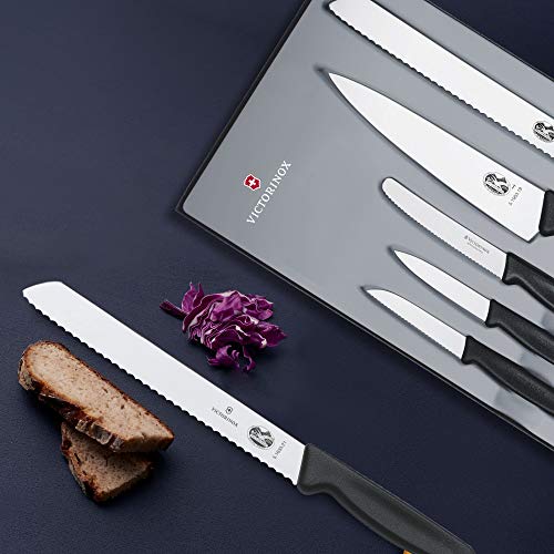 “This set has 3 Paring knife, 1 Carving knife & 1 Bread knife. SWISS MADE PARING KNIFE – The Victorinox Kitchen knife is a combination of beautiful form and function – perfect tool for home chefs to use for easy and clean chopping. Sought after by professional chefs as well, the knife can cut into meat, fruits, vegetables, and fish effortlessly. SWISS MADE BREAD KNIFE – The sharpness that’s designed to perfection: This knife comes with just the level that can cut through the buttery tenderness of your dairy products. It is designed to perfection to not just do the job, but do it in the best way. It is high on utility, to give you the best cutting experience as you get the perfect slice. The edge on the knife further prevents the slices from breaking. SWISS MADE CARVING KNIFE – The Victorinox Swiss Modern Carving Knife makes the laborious task of carving large joints and cuts of meat easier. Whether you are dicing a pork shoulder or slicing through roast beef or a steak, this carving knife ensures effortless chopping.”