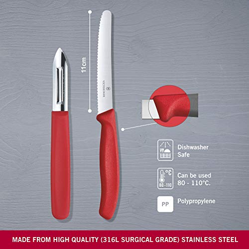 Comfortable Ergonomic Grip: The red slip-resistant handles are made using polypropylene for added robustness, durability, and control. The comfortable ergonomic design offers a firm grip and perfect balance for seamlessly cooking your favorite dishes and cuisines. Its supreme agility and fantastic finish make every peeling, chopping, and slicing an absolute dream. The good quality blades and handles used to build this utility set makes it dishwasher safe and easy to care for.