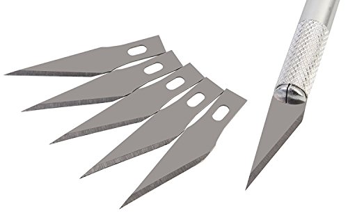 Five stainless steel razor sharp blades with handle. Ideal for Cutting Intricate Details on Paper, Cloth, Cardboard, Thermocol, Plastic, Wood Carvings and Lightweight Craft Materials.