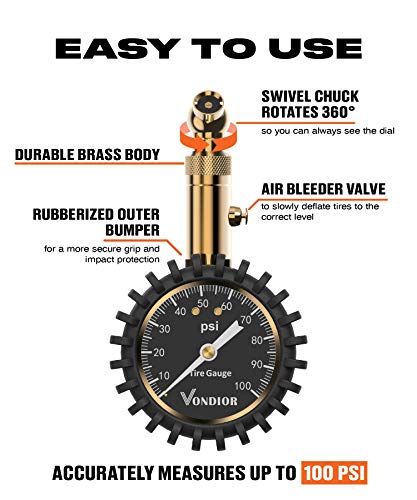 HIGH PERFORMANCE LOW MAINTENANCE – She is your pride and joy. Your car is one of your partners in life. Making sure it performs at its best takes tender loving care, which means essentially checking tire pressure regularly. But going to the garage or gas station is a hassle. Highly calibrated accurate to ±1% full scale of 100 PSI range VONDIOR tire pressure gauge will make sure your tires are good to go! Includes a swiveling valve connector, rotating on its’ axis for maximum convenience.