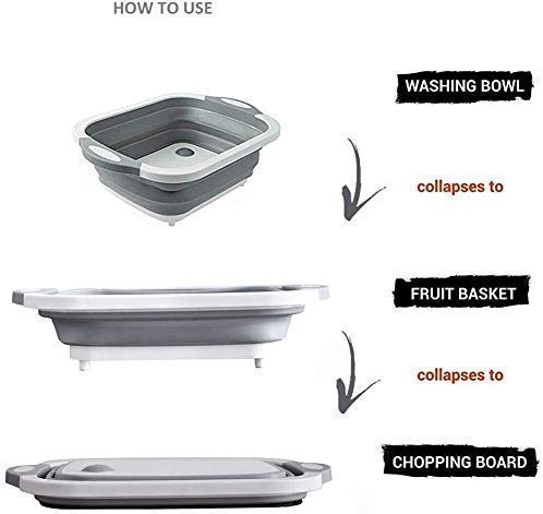 Multi-function cutting board: Three-in-one kitchen gadgets – cutting board, vegetable washing basket, drain basket. Can be used on the sink or on the countertop. Can be used as a sink, fruit and vegetable sink, drain sink and storage basket.