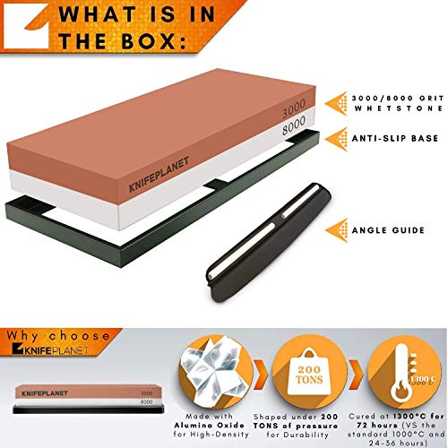 ✅ NOT YOUR “AVERAGE” KNIFE SHARPENER STONE: Unlike the majority of low-density “glued-together/double-grit” stones found in the market nowadays, our KNIFEPLANET 3000/8000 Dual-Grit Wet Stone Kit has High-Density SINGLE WHETSTONES with different Coarseness masterfully developed on both sides of the SAME water stone, thus exponentially increasing its longevity, durability and sharpening precision