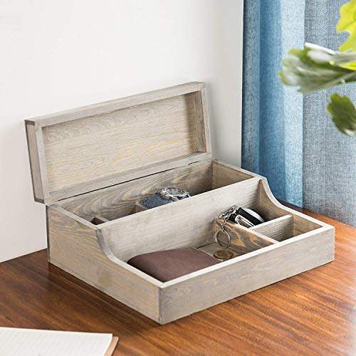 Features 4 enclosed slots for watches, 1 large section and 2 smaller sections for keys, cell phones, wallets and more.