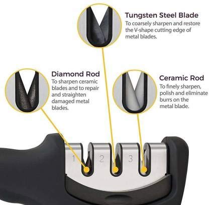 ANTI SKID DESIGN: This knife sharpening tool is Non-slip rubber base helps you to keep it in position while sharpening the blades and it also has ergonomically designed handle for comfortable grip.