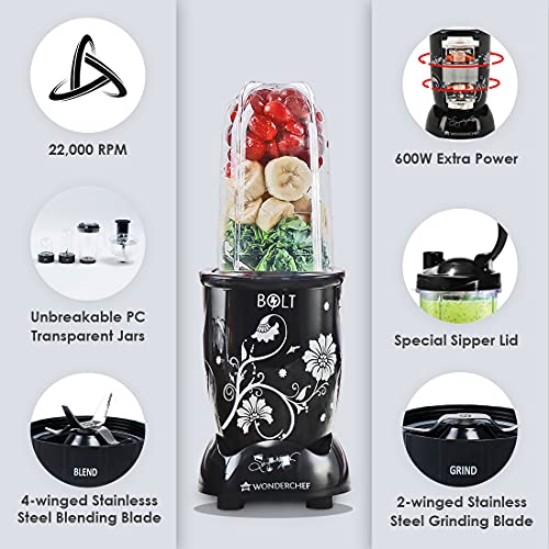 Wonderchef Nutri-blend BOLT-600W Mixer with Food Processor, Stronger & Swifter with Sipper Lid, 22000RPM, 4 Unbreakable Jars, Sharper Steel Blades, 2 Yr. Warranty, Black, E-Recipe Book by Chef Sanjeev Kapoor