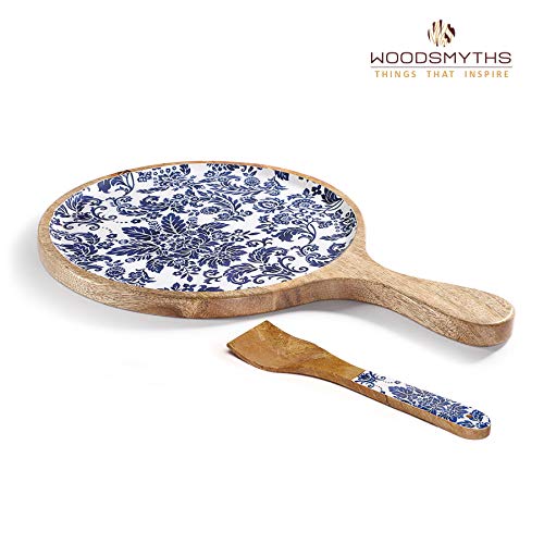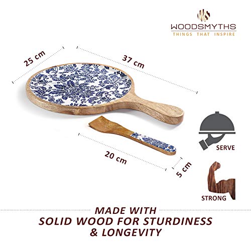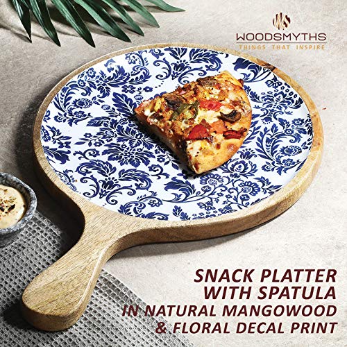 Woodsmyths – Casa Blanca Snack Platter with Spatula – Exotic Floral Decal Printed Serveware Set in Natural Mangowood (Set of 2 Pcs)