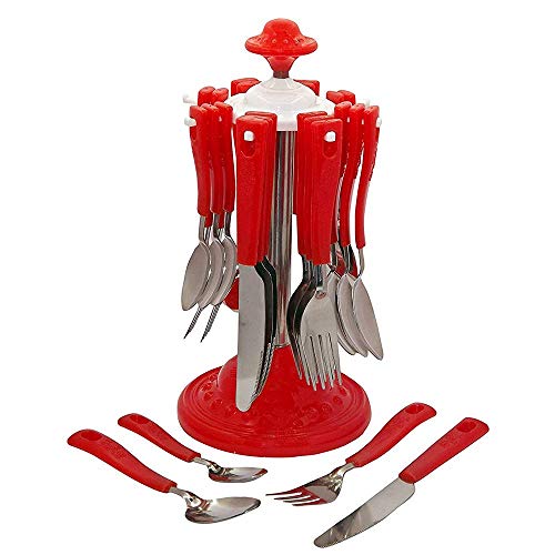 Package Content :- 24-Piece Cutlery Set With 1 Stand, 4 Different Type Of Spoons, 6 Dessert Spoon, 6 Soup Spoon, 6 Tea Spoon, 6 Fork. Material :- ABS Plastic & Stainless Steel