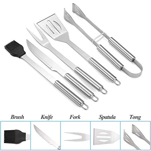 3.Comes with a oxford storage bag, portable and convenient to carry. Long handles keep your hands protected from hot grills and flames. Designed with hanger, it allows you to hang the grilling tools when not in use.