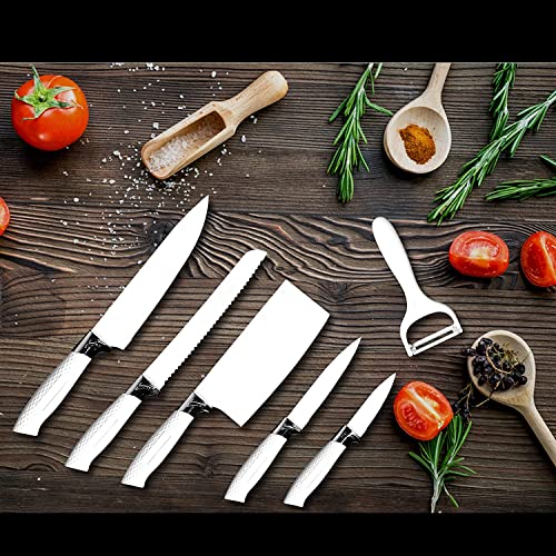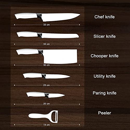 Compelete Kitchen Knife Set of 6 Pieces: The knife set includes a 6.5 inch Chopper knife, a 8 inch Chef knife, a 8 inch bread knife, a 5 inch Utility Knife, a 3.5 inch Paring knife, a peeler