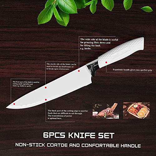 Attention: Cleaning before first use, please clean the knives with hot water and cleaner, rinse out well, when finished carefully wipe dry with soft towel. PLEASE AVOID direct contact with blade edge! After use please clean and store in a safe place, store away from children reach! Kitchen knife set is constructed of non-stick, coated blades that ensure long lasting durability and cleanliness 6 Piece Stainless Steel Professional Kitchen Knife Set, Precision Sharp Knives and Stylish.