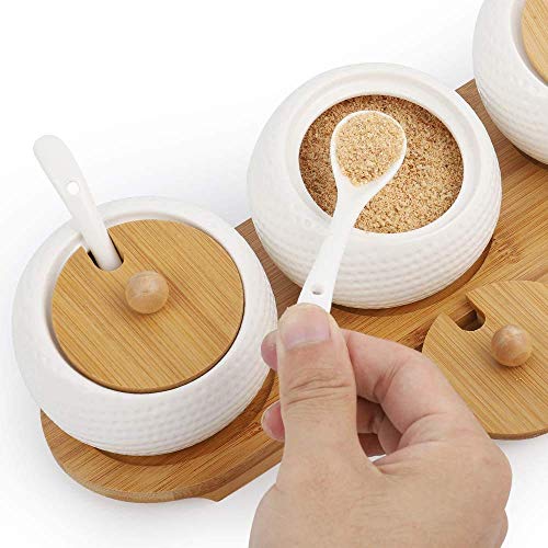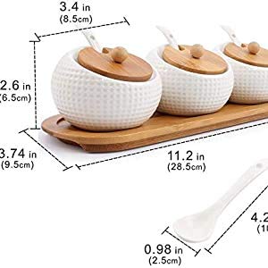 Package Included 3 x Ceramic Condiment Pots with Lids 3 x Ceramic Serving Spoons 1 x Wooden Tray
