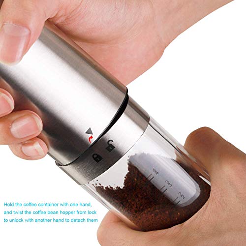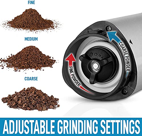 【ADJUSTABLE GRIND SIZE REFINE TASTE】Clockwise from coarse to fine grind, Coarse– for French Press (Thick, Rich, Blod), Chemex (Crisp, Clean), Medium–for Drip Pour Over coffee (Light, Acidic), Fine– for Aeropress (Bold, Less Acidic) Espresso Grinder (Strong, Bitter )