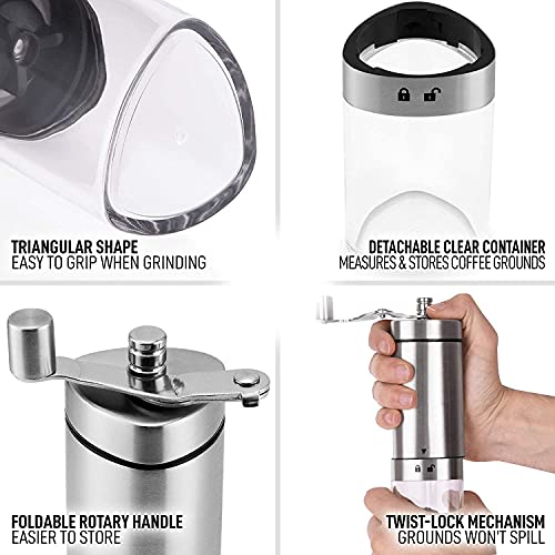 【REASONABLE DESIGN】Arc triangular prism easier to hold, allowing you to grind coffee more effort. Folding rocker takes up less space, you can more easily carry it anywhere. The lower part of the transparent design allows you to see more clearly coffee powder.