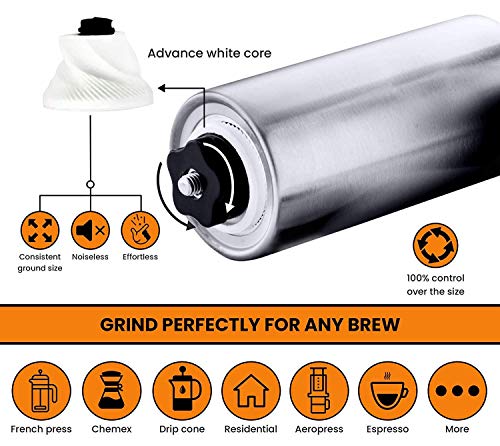 DOES NOT NEED BATTERIES OR CORDS: Handheld coffee bean grinder is convenient and does not need any batteries, long plastic cords, or power to use outside. Its detachable hand crank device reliably removes over 90% of the sound that an electric grinder produces.
